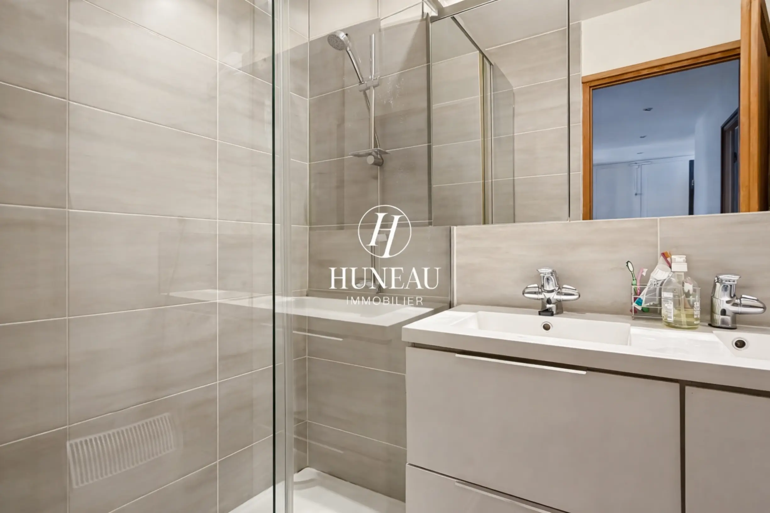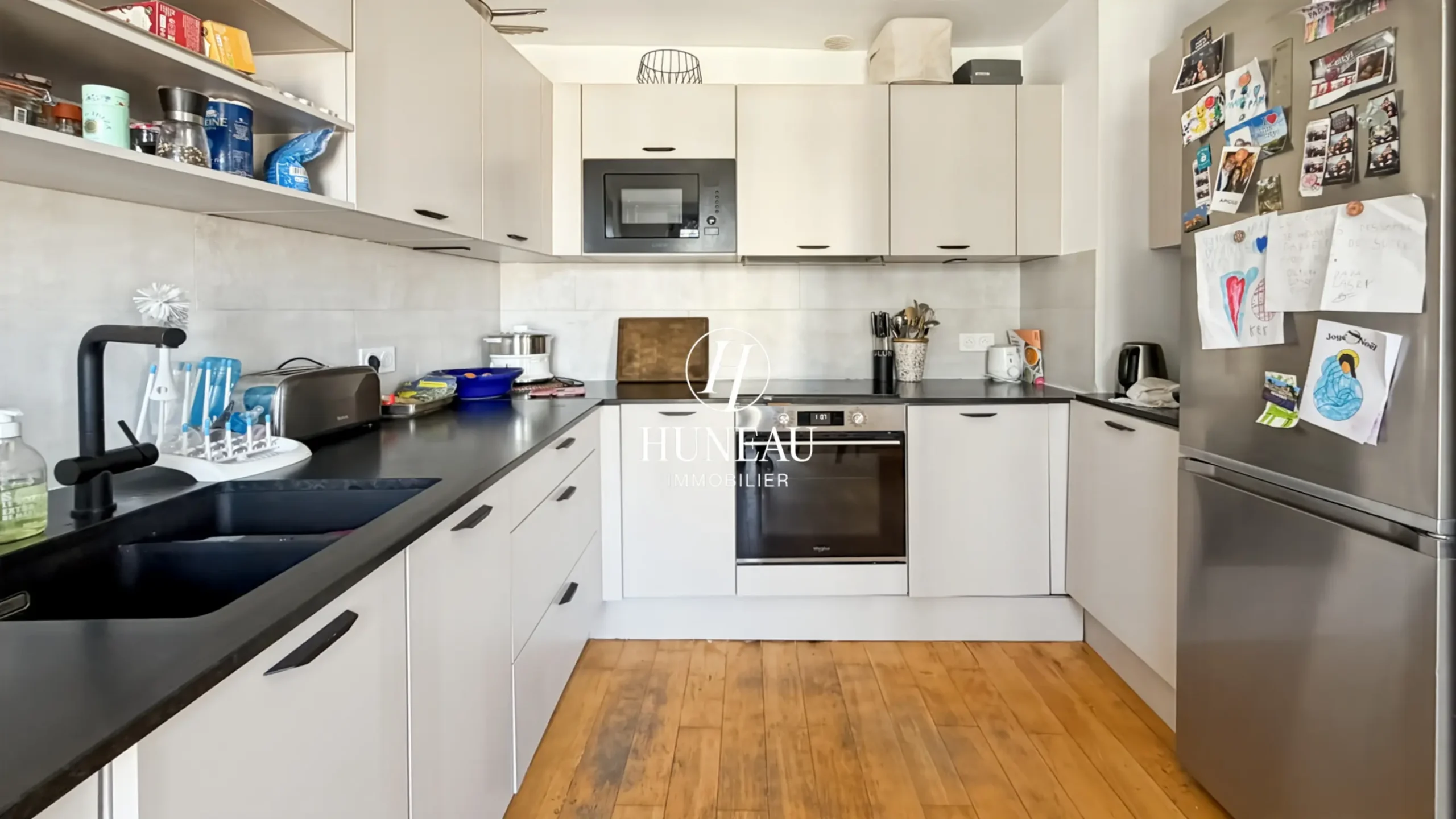 Cet appartement comprend : une entrée, un séjour avec balcon filant et sa cuisine américaine toute équipée, deux chambres chambres avec placards, une salle d’eau avec douche, ainsi que des toilettes séparés et de nombreux espaces de rangements.